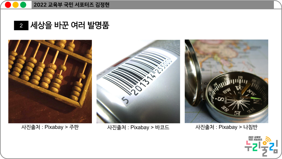 영국에서 발표한 ‘세상을 바꾼 101가지 발명품(2007)’에서 소개된 발명품을 이야기해보면 주판, 바코드, 나침반 등이 있었습니다. 각 발명품은 우리 일상에 자연스럽게 스며들어 더욱 편리한 삶을 누릴 수 있게 하였습니다.