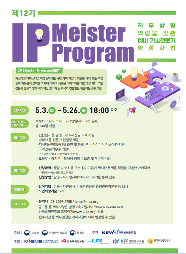 이 프로그램을 통해 참가자들은 멘토와 함께 교육과 컨설팅을 받고, 선발된 팀의 경우 발명과 지식재산권 교육과 함께 지식재산권(특허) 출원을 지원받을 수 있습니다. 생생한 발명 현장의 이야기를 들으며 새로운 도전을 자유롭게 시도해 볼 수 있으니, 발명에 관심 있는 특성화 고등학교 학생들이라면 한 번 도전해보는 것은 어떨까 싶습니다.