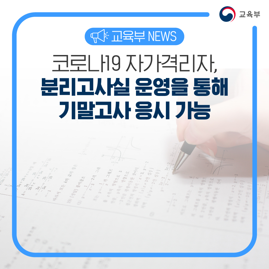 코로나19 자가격리자, 분리고사실 운영을 통해 기말고사 응시 가능 - 확진·의심증상 학생 대상 기말고사 운영 관련 기준(가이드라인) 발표 -