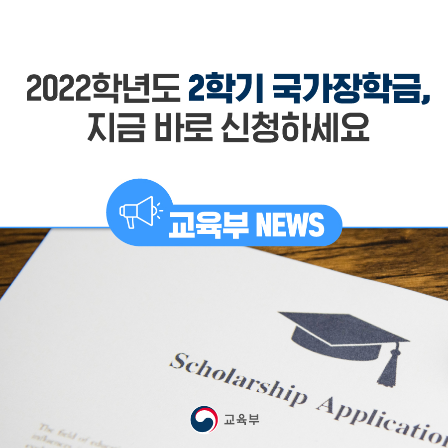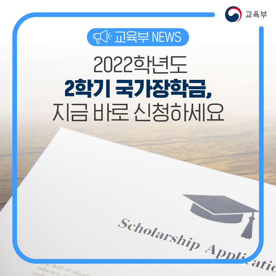 교육부와 한국장학재단(이사장 정대화, 이하 ‘재단’)은 2022학년도 2학기 국가장학금 신청을 5월 24일(화) 9시부터 6월 23일(목) 18시까지 접수한다.