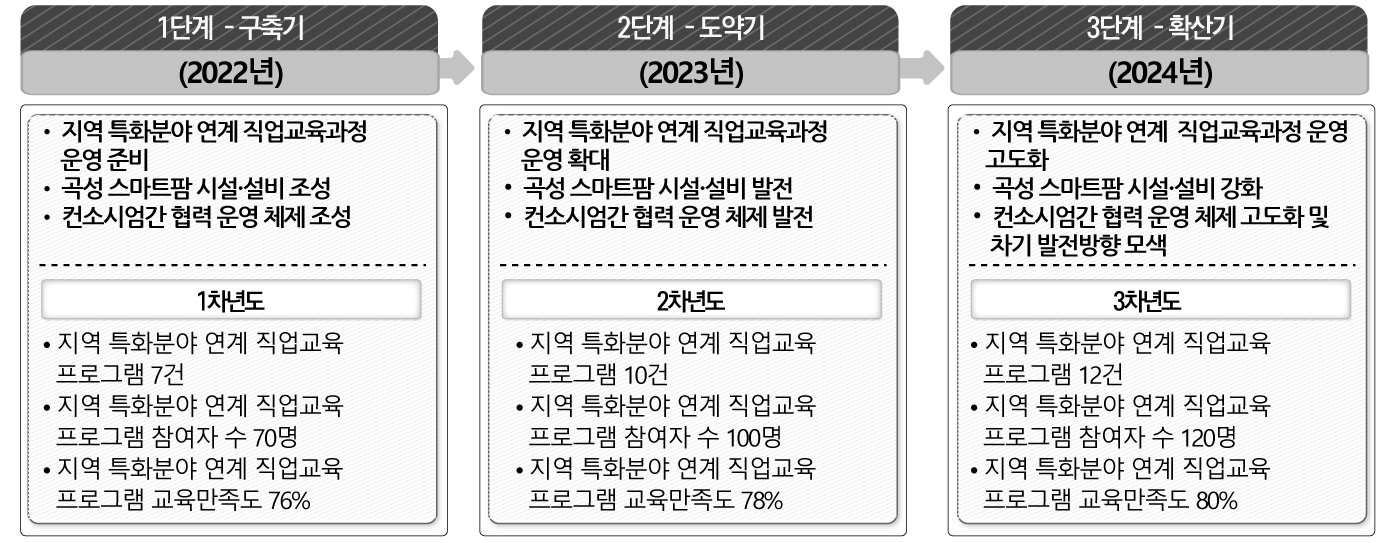 ㅇ (특화분야 선정 배경 및 인력양성) 주력산업인 농업 경쟁력 강화를 위해서는 스마트팜 도입을 적극적으로 추진하고 있으며, 지역 내 스마트팜 조성을 위한 전문적인 교육을 통해 청장년층 인구 유입 및 청년농부 육성 등 지역 경쟁력 강화 필요 ㅇ (지역사회 평생직업교육 고도화 추진 방향) 청년, 귀농‧귀촌인, 생애전환기 신중년의 스마트팜 영농 취‧창업 지원을 위한 시설‧설비 시공 및 유지관리 교육 인프라 구축 - 미래 관‧산‧학 임대형 스마트팜 조성 및 공동 운영을 위한 협업체제를 구축하고, 취창업(생산)-교육-거주를 통합적으로 지원하는 관‧학 공동 정주여건 조성 ㅇ (연계 교육프로그램 운영) 지역 특화분야(스마트팜) 관련 학과와 연계한 지역주민, 산업체 재직자 대상 직업교육심화과정 운영하고 체계적 관리를 위한 3개년 연차별 계획 수립‧추진 ![]() ![]() |