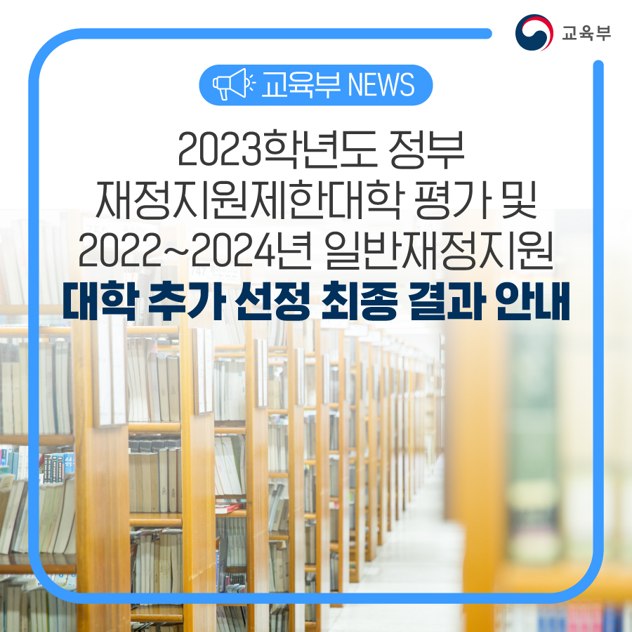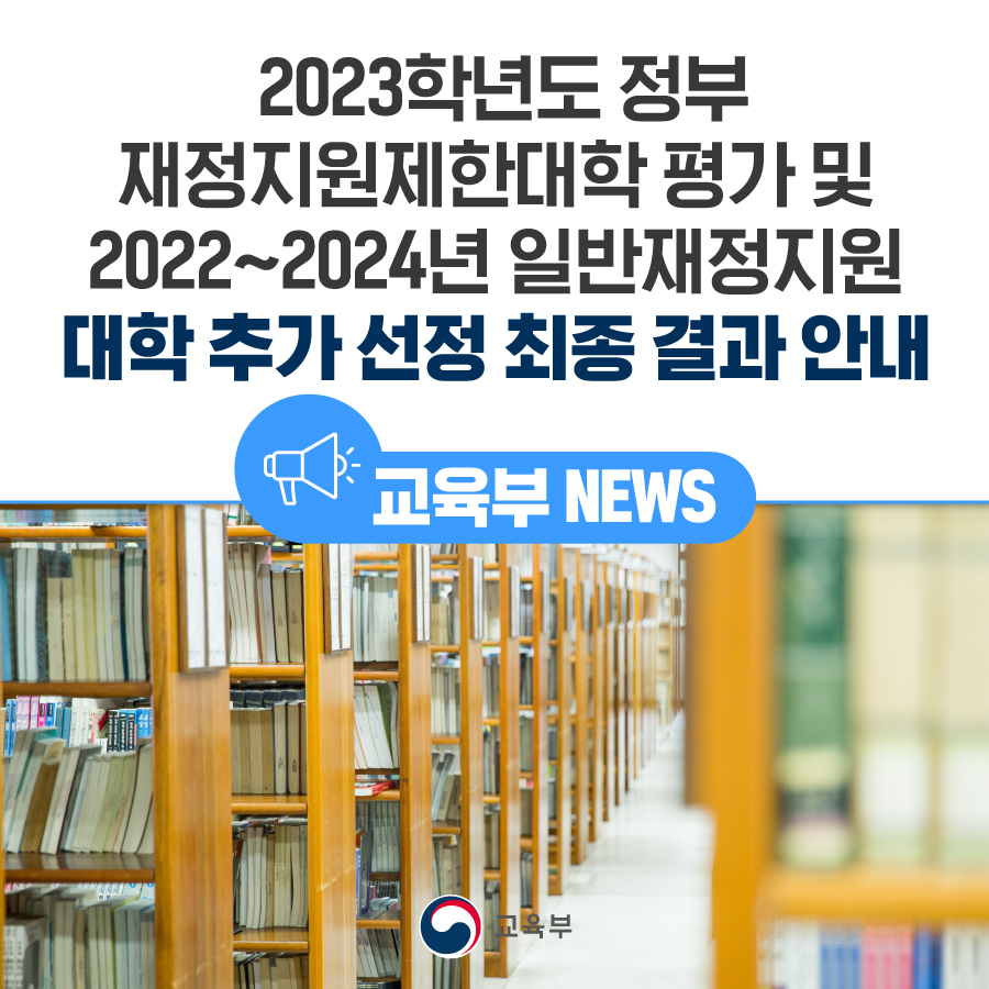 교육부와 한국교육개발원(원장 류방란)은 대학구조개혁위원회(위원장 김규원) 심의를 거쳐 2023학년도 정부 재정지원 가능대학 명단(총 277개교)과 2022~2024년 일반재정지원 대학 추가 선정(이하 ‘추가 선정’) 최종 결과를 6월 3일(금) 확정하여 발표했다.