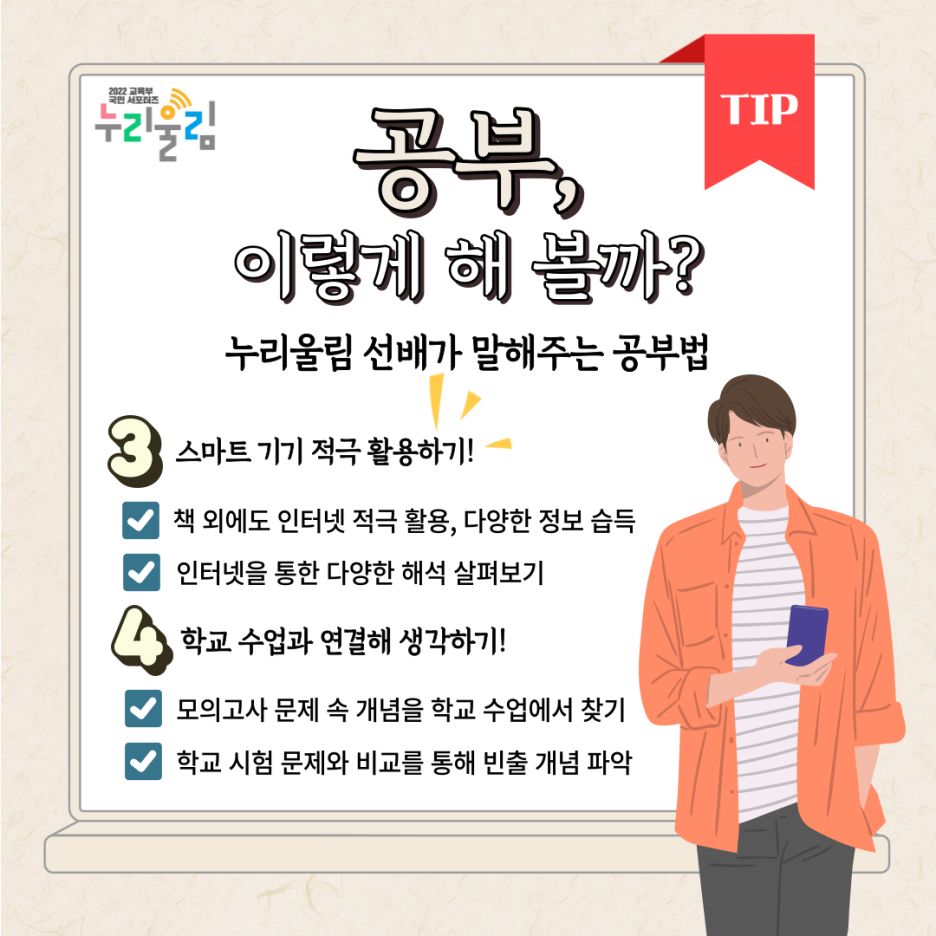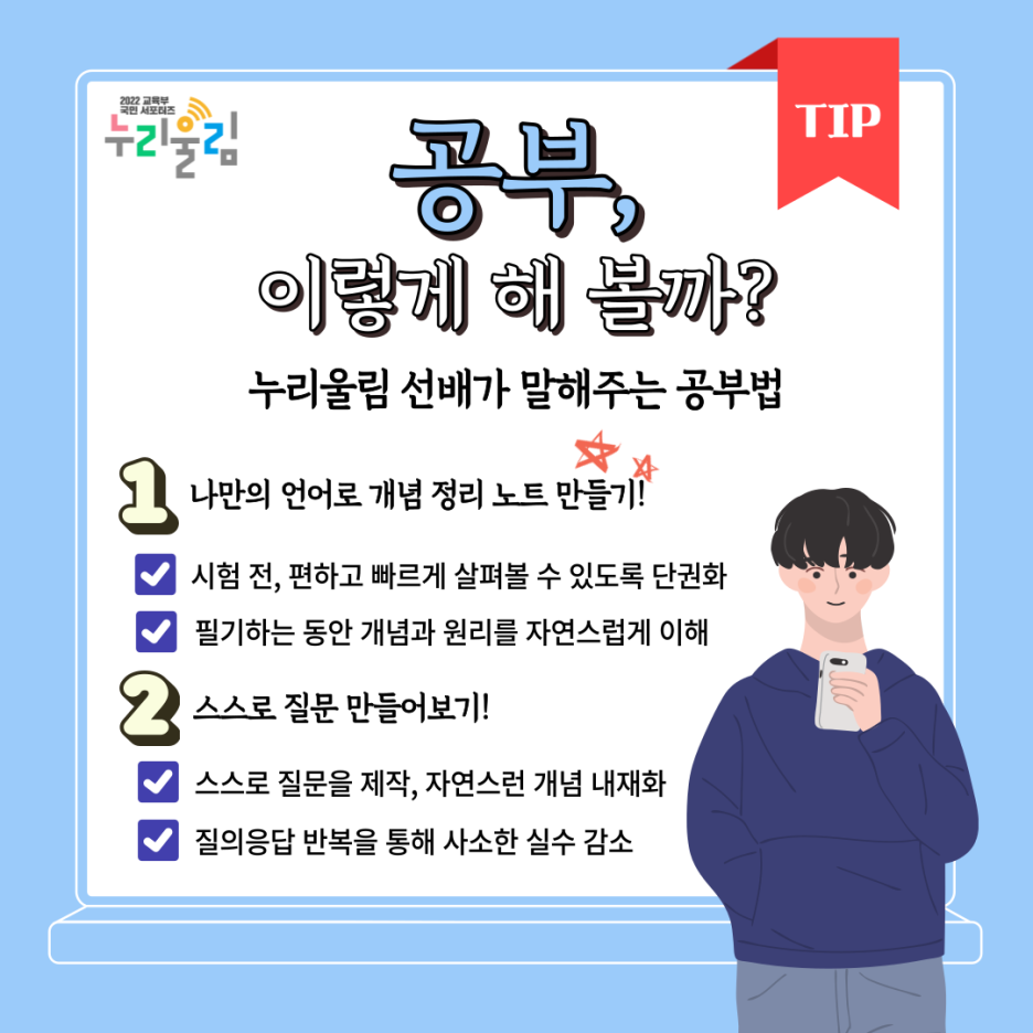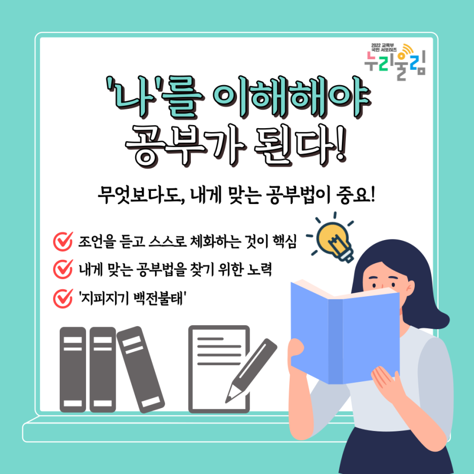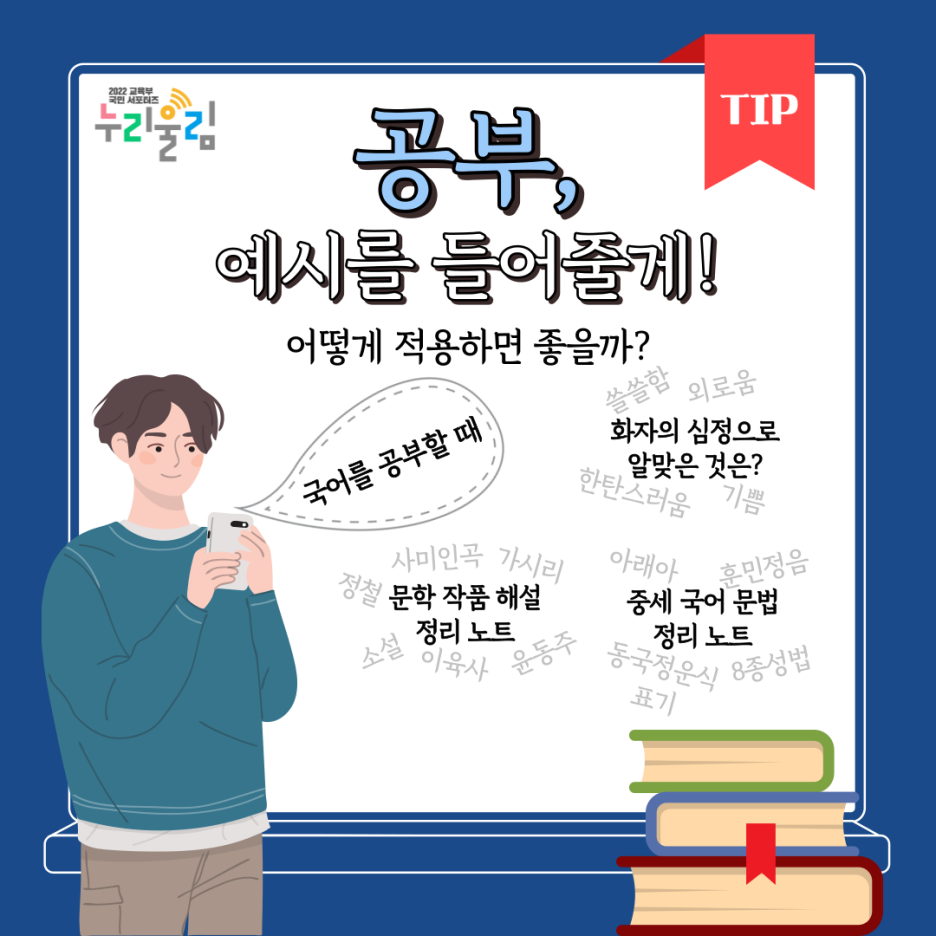 앞서 설명한 공부법을 국어 공부를 예시로 들어 설명하겠습니다. ‘나만의 언어로 개념 정리 노트 만들기’는 과거 시험에 등장했던 다양한 문학 작품 해설을 정리한 문학 해설 정리 노트, 중세 국어 문법 개념을 정리한 노트 등으로 적용해볼 수 있겠습니다. ‘스스로 질문 만들기’는 문학 작품 속 화자의 심정을 묻는 문장이나 문법을 묻는 문장을 만들어 답해볼 수 있겠네요. 이외에도 수학 과목의 경우 자주 잊어버리는 수학 공식을 적은 노트나 오답 정리 노트를 만들고, 인터넷을 통해 다양한 풀이법을 습득하는 식으로 적용할 수 있겠습니다!