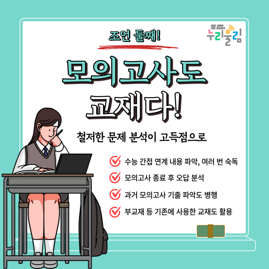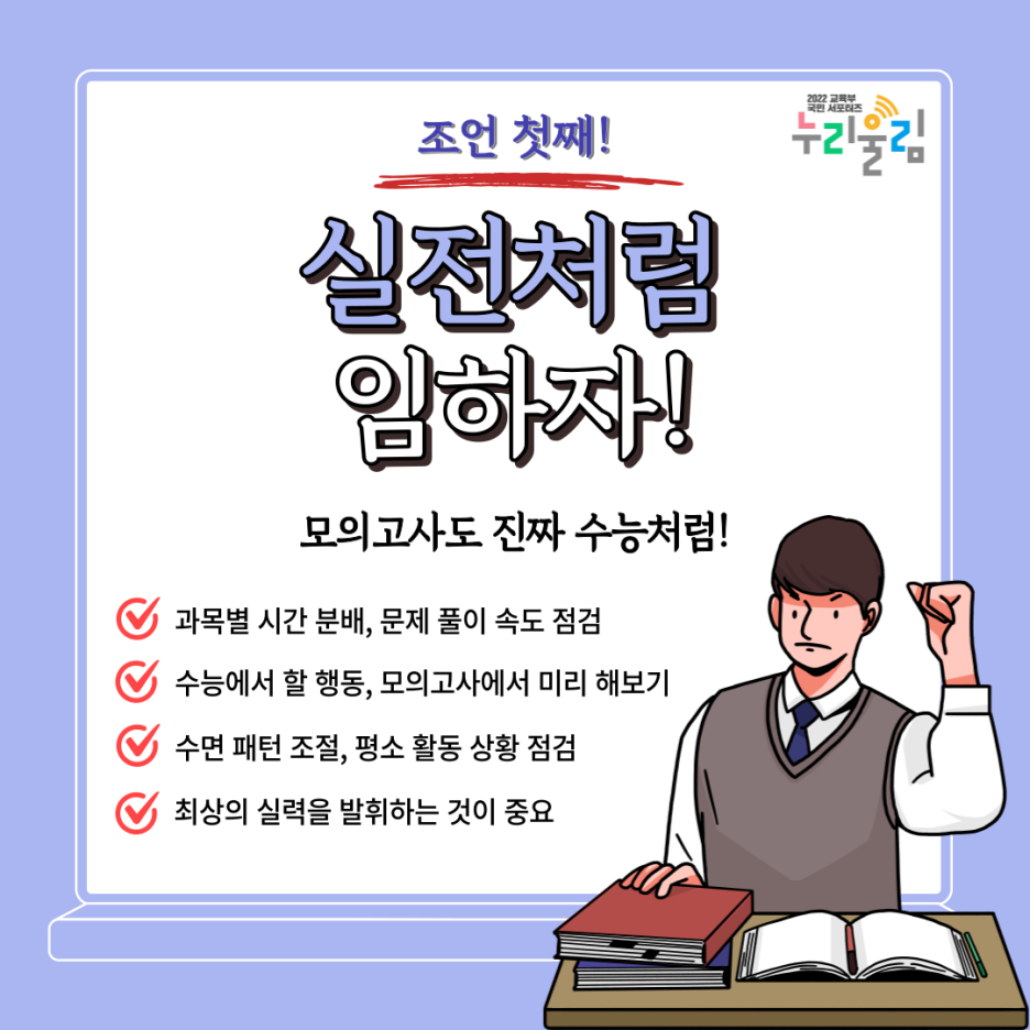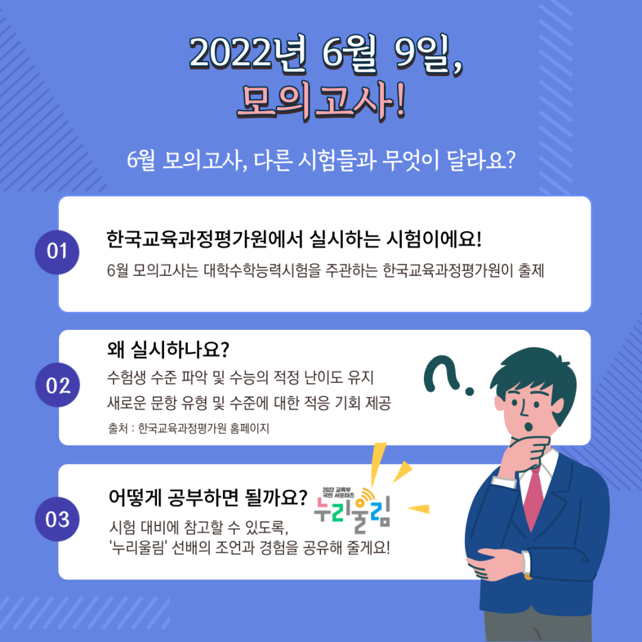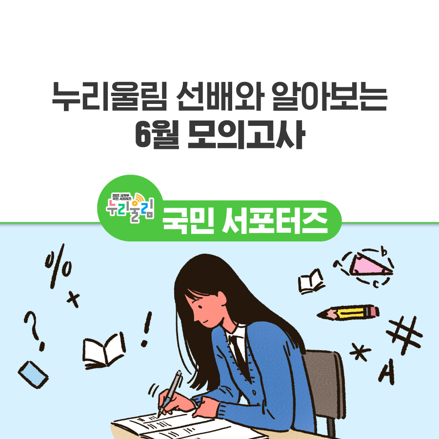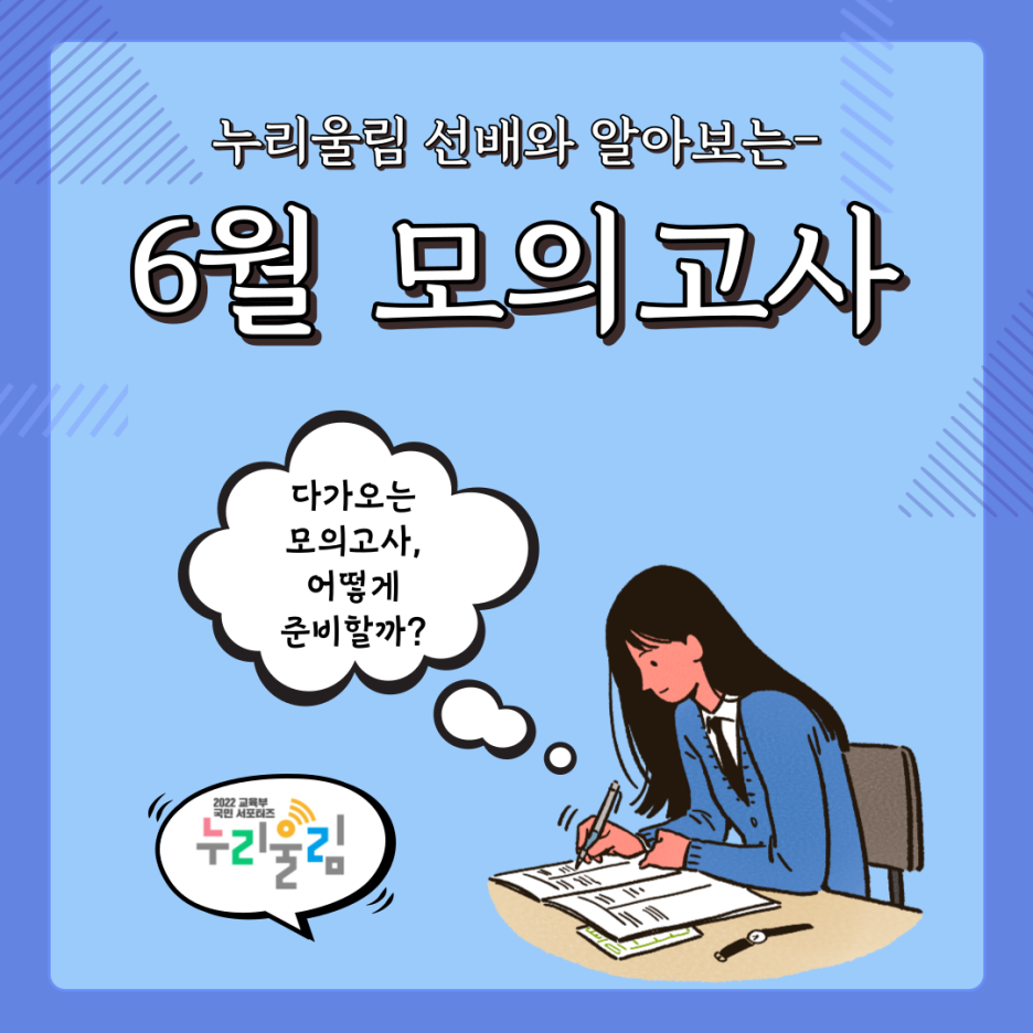 며칠 뒤인 2022년 6월 9일, ‘6월 전국연합학력평가’가 이루어집니다. 선배들 혹은 선생님께 들어서 익숙할 이 ‘6월 모의고사’는 수능을 주관하는 한국교육과정평가원에서 시행하며, 학생 여러분의 수준을 파악하고 올해 수능의 적정 난이도를 설정하기 위해 치러집니다. 무엇보다 새로운 문항 유형이나 수준에 대한 적응 기회를 제공하기 때문에, 이번 시험을 수능을 위한 발판으로 삼을 준비를 단단히 해 두시는 편이 좋습니다! 갑작스럽게 시험을 준비하려니 떨리는 여러분도 계실 텐데요. 걱정하지 마세요! 그런 여러분을 위해 누리울림 선배가 6월 모의고사 준비를 위한 조언과 경험을 공유해 줄 테니까요.