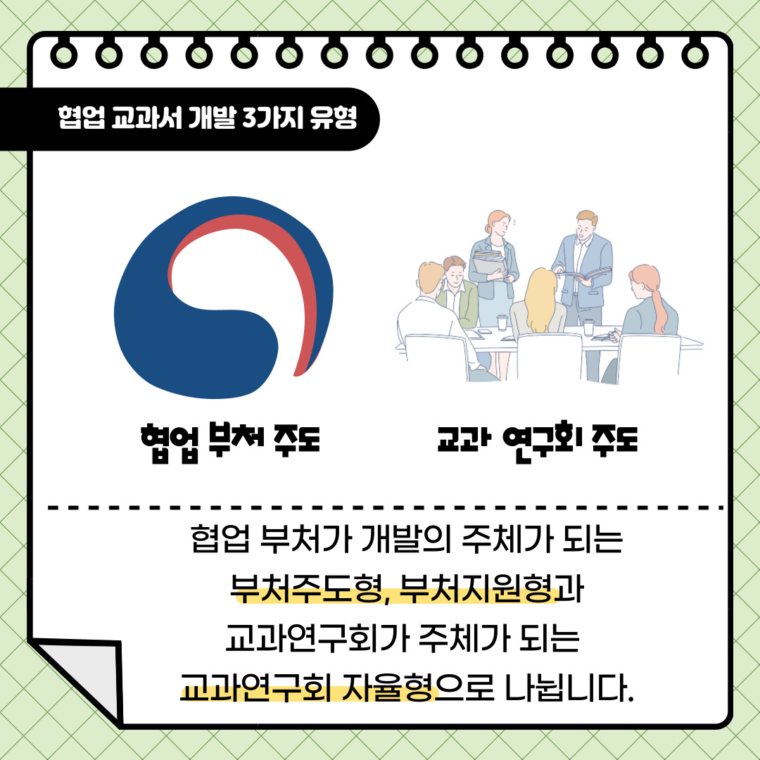 협업 교과서의 개발 유형은 크게 ‘부처주도형, 부처지원형, 교과연구회 자율형’으로 나뉘는데요. 각 유형에 대해 자세히 알아볼까요?