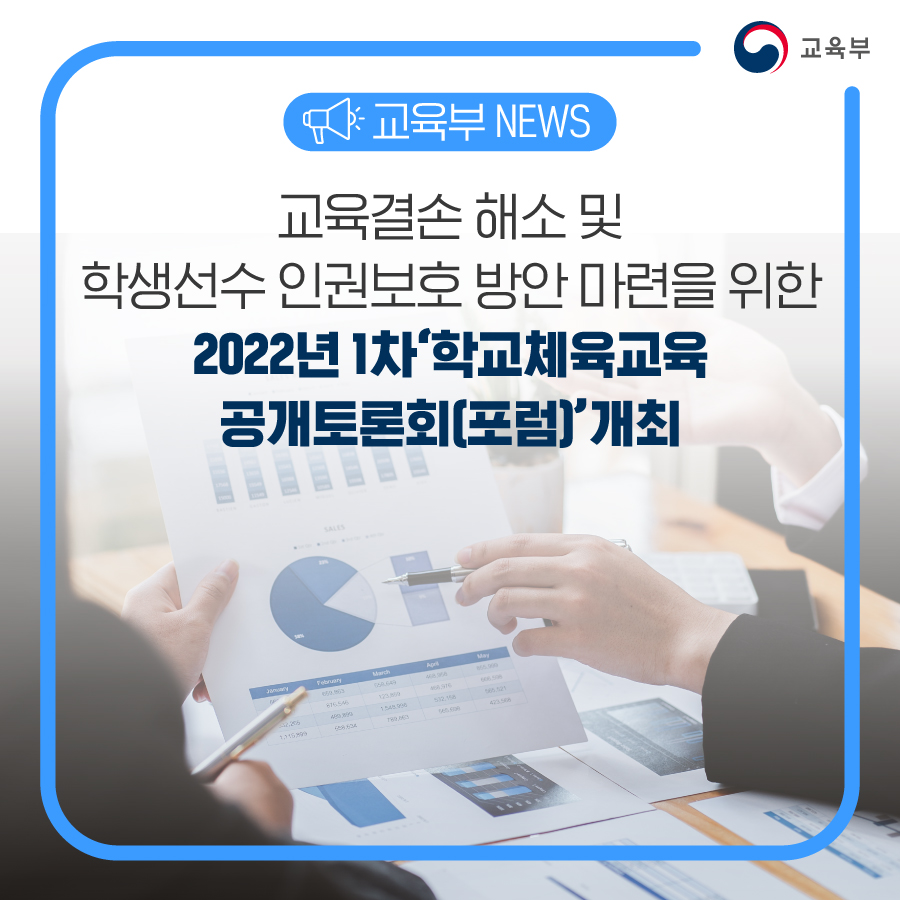 교육부와 학교체육진흥회*는 ‘제1회 2022년 1차 학교체육교육 공개토론회(포럼)’를 6월 16일(목), 한국교원대학교 청람아트홀에서 개최한다.