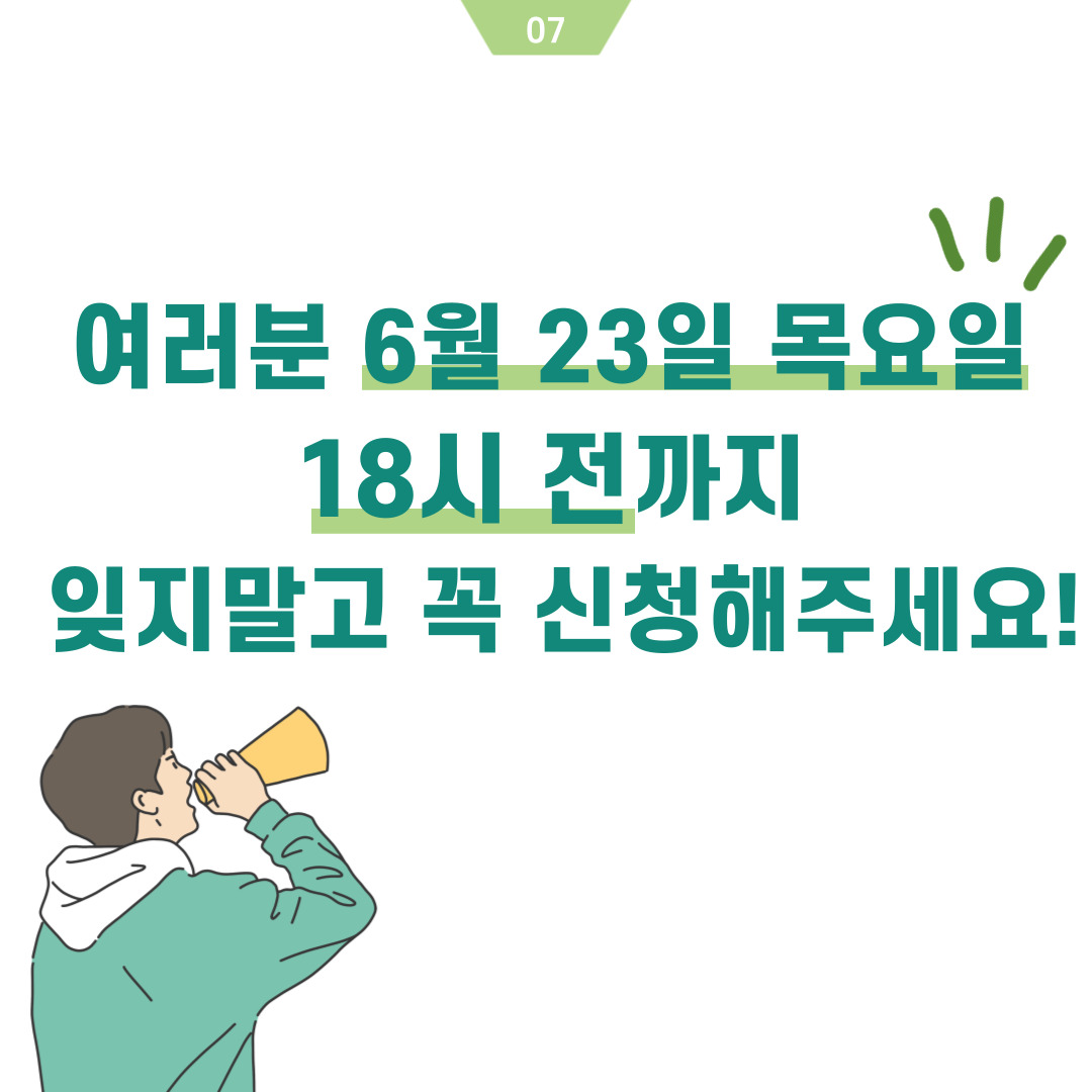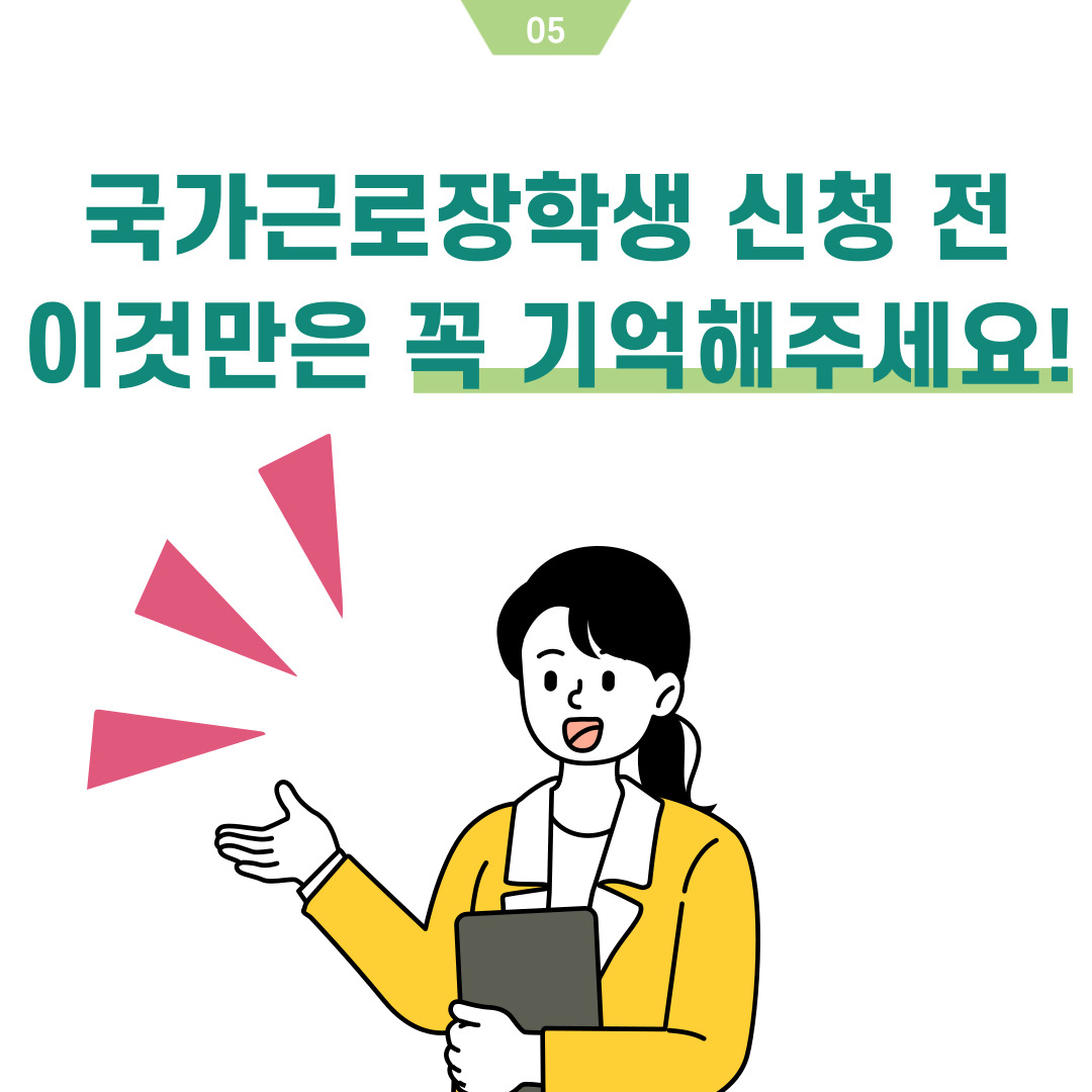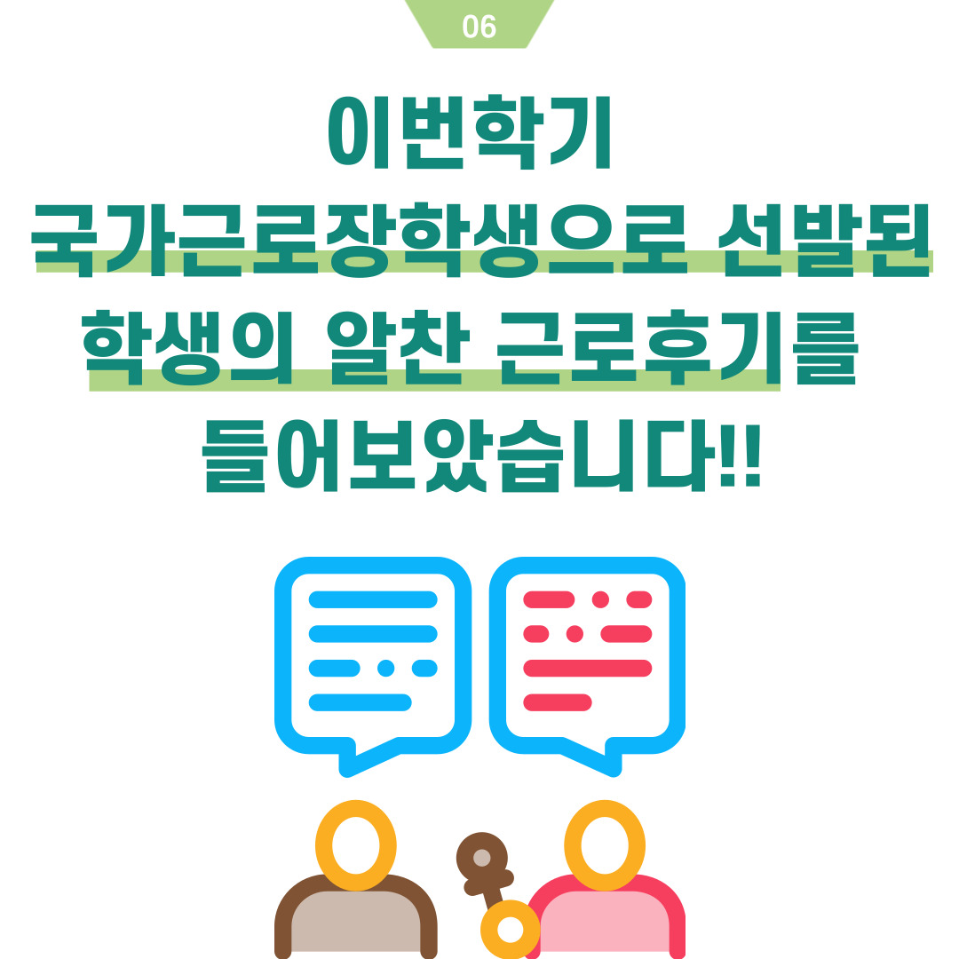 A. 일단 6월 23일 목요일 18시 전까지! 한국장학재단 홈페이지에 들어가 국가근로장학금 꼭 신청해주시고요. 국가근로에는 제가 한 일반교내근로 외에도 일반교내근로, 취업연계유형 등의 다양한 종류가 있으니까요. 여러분들과 맞는 국가근로 유형을 꼭 찾으셔서 2학기에도 알찬 대학생활 되시길 바랍니다>_<