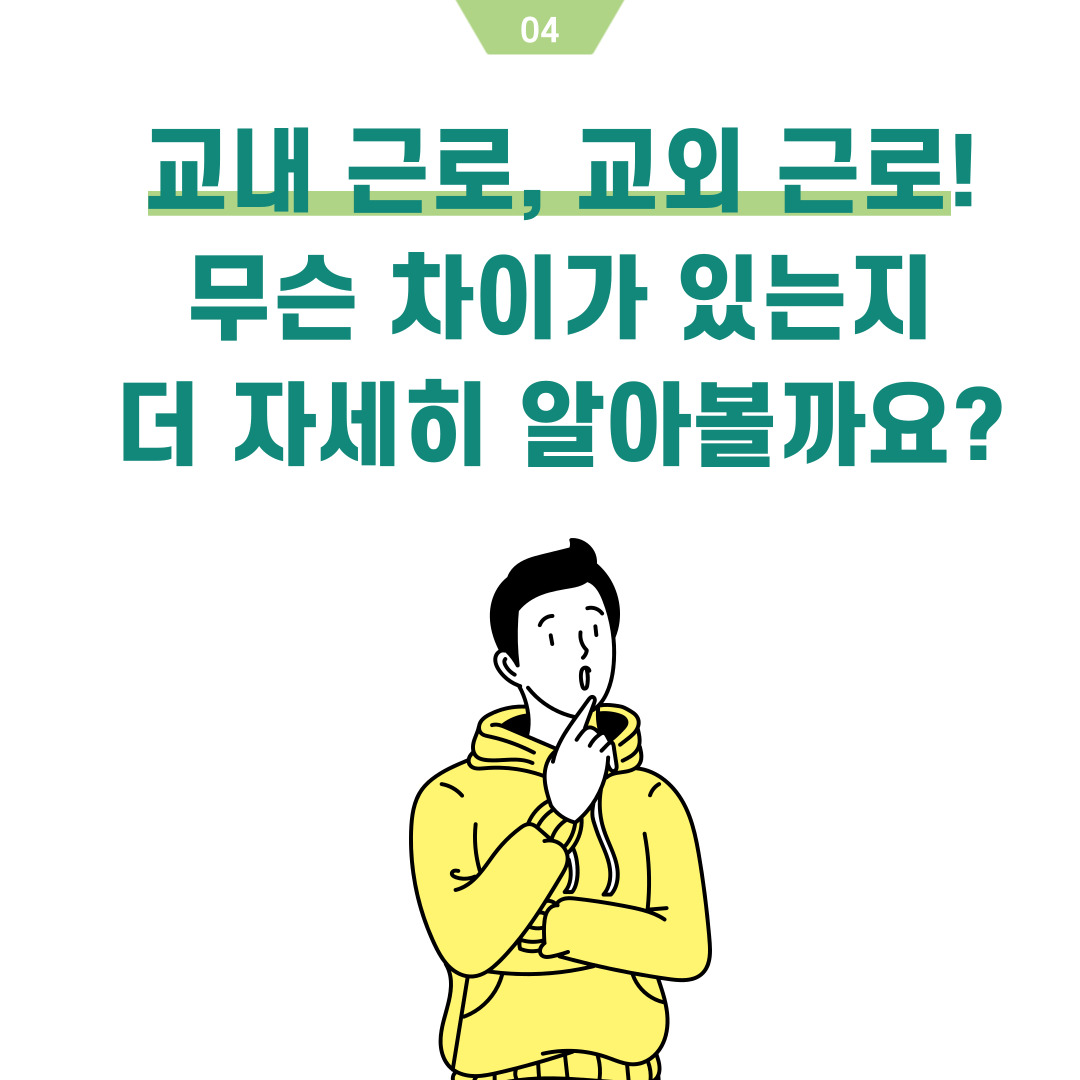 교외 근무는 주로 공공청사, 지역아동센터와 같은 근무지에 지원할 수 있습니다. 근무 특성상 근로지까지 직접 이동을 해야하기 때문에 근로자에게 부담이 갈 수 있지만, 그만큼 시급이 더 지급되기 때문에 ‘나는 돈을 더 벌고 싶다!’ 하시는 분들에게 추천합니다. 교외 근무는 주로 행정 업무를 맡는 교내 근무와는 다르게 학교 밖에서 자신에게 필요한 업무 경험을 할 수 있는 곳을 선택할 수 있다는 장점이 있습니다.