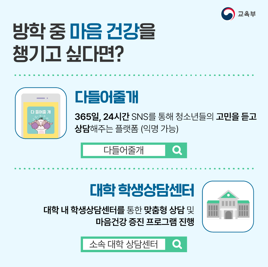 #교육부 #대학생 #여름방학 #KMOOC #대학생튜터링 #마음건강 #다들어줄개 #대학학생상담센터