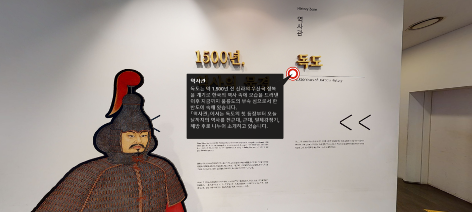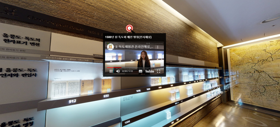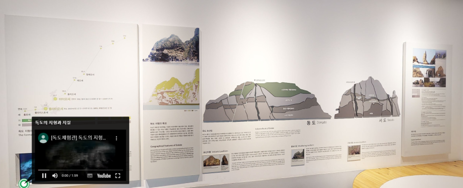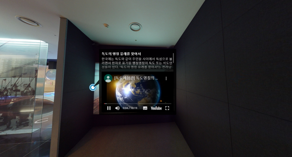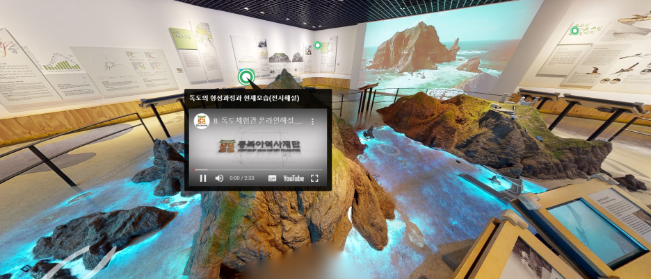 초록색 원을 선택하거나 바닥의 동그란 원이 표시되어있는 곳을 선택하면 해당 전시물을 확대해서 관찰한다거나 전시물을 관찰하기 좋은 가장 좋은 위치로 시점을 이동시켜주는 점도 편리했습니다. 예시로 자연관에 설치된 독도 전시물 위 초록색 원에 마우스를 갖다 대고 잠시 기다리니 ‘독도의 형성과정과 현재 모습’이라는 전시해설을 유튜브를 통해 바로 감상할 수 있었습니다.