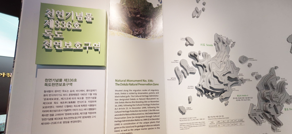 자연관에서는 제336호 천연기념물로 지정된 독도가 가지는 자연적인 중요성, 독도의 기후 그리고 화산의 분출로 만들어진 독도의 지형/지질학적 특성까지 다양하고 유익한 정보를 얻을 수 있었습니다.