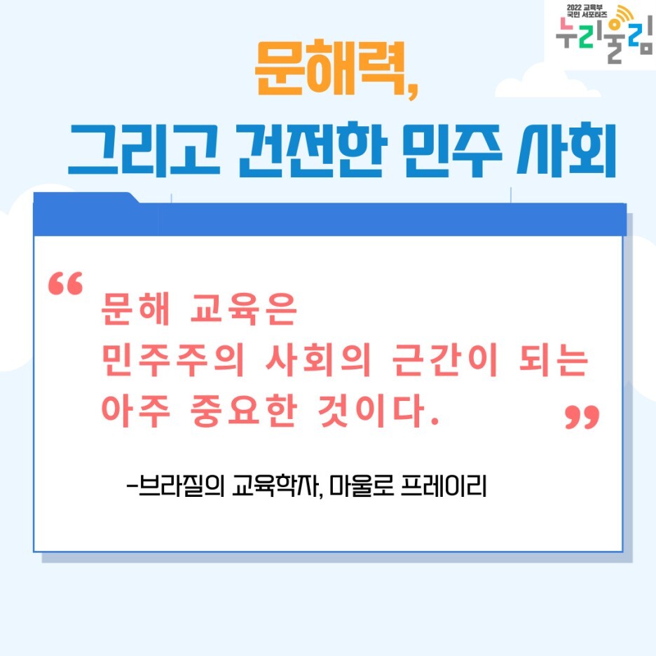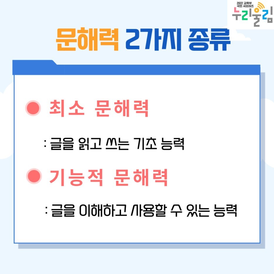 사회·경제적 활동은 물론이고, 일상생활에서도 큰 불편함을 느끼게 하는 문해력 부족! 이처럼 문해력은 현대사회에서 일상적인 삶을 영위하는 데에 꼭 필요한 역량입니다.