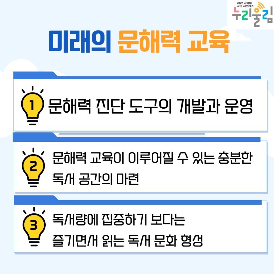 문해력 향상의 핵심인 독서의 중요성에 대해서는 한국교육과정평가원 이경남 교수학습연구실 부연구위원은 "독서 교육을 위해서는 가정, 학교, 국가 그리고 다양한 정책이 필요합니다. 그리고 다양하고 좋은 지도 방법이 있어도 독서 공간이 없으면 무용지물입니다. 가정, 학교 그리고 도서관에서 어떻게 독서 공간을 만들 수 있을지에 대한 공간 활용 방법에 관심이 필요하다고 생각합니다.”라고 말하며 문해력 교육이 이루어질 수 있는 공간 마련의 중요성에 대해 이야기했습니다.