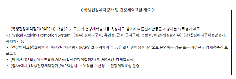 우선, 신속한 체력진단에 따른 맞춤형 프로그램 지원을 위해 학생건강체력평가(PAPS)를 상반기 중 완료할 예정이며, 그 결과 등에 따라 건강체력교실을 다양한 방식으로 운영할 수 있도록 지원한다.