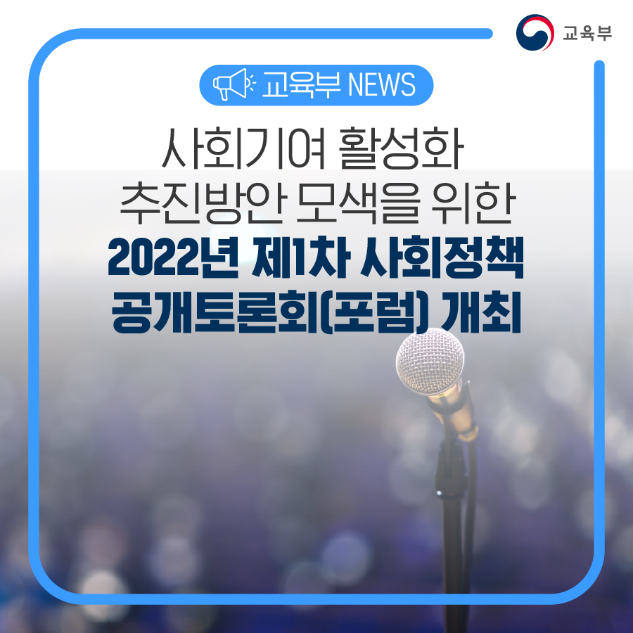교육부는 한국직업능력연구원 등 사회분야 연구기관*과 함께 ‘사회기여**활성화 추진방안’을 주제로 6월 29일(수), 제1차 공개토론회(포럼)를 개최한다.