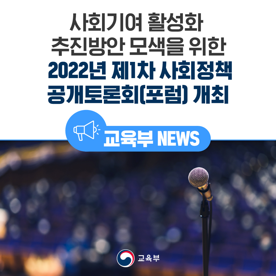 교육부는 한국직업능력연구원 등 사회분야 연구기관*과 함께 ‘사회기여**활성화 추진방안’을 주제로 6월 29일(수), 제1차 공개토론회(포럼)를 개최한다.