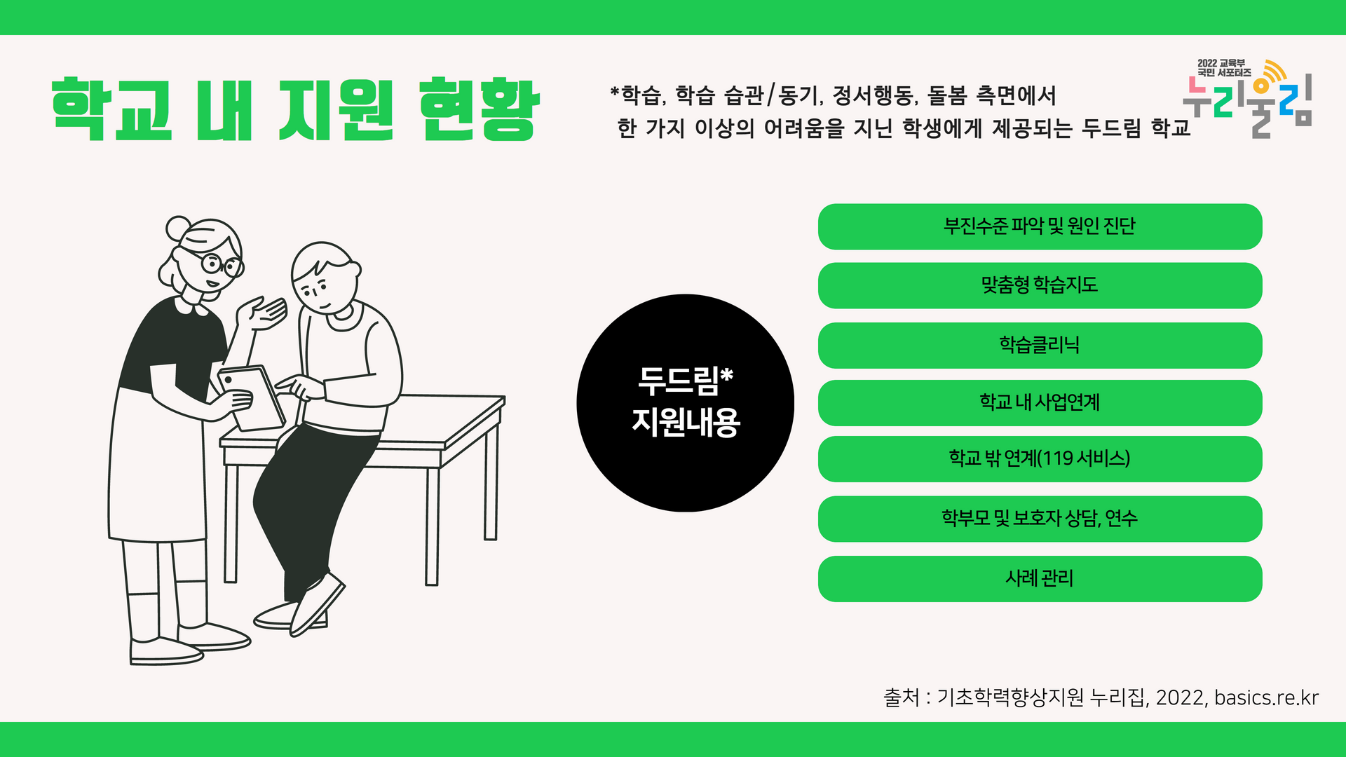 마지막으로 국가 차원에서 대규모 기초학력 지원 사업이 진행되는 만큼 기존 인력들로 학생 전부를 지원하기에는 어려움이 있다는 문제를 해결하기 위해 학습클리닉센터가 설치됐습니다. 센터를 통해 교육 사각지대를 최소화하여 최대한 많은 학생이 기초학력을 함양할 수 있게 되었습니다.