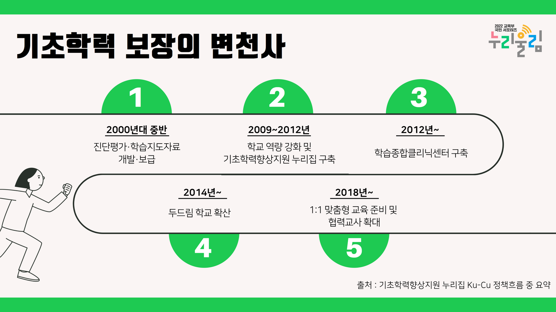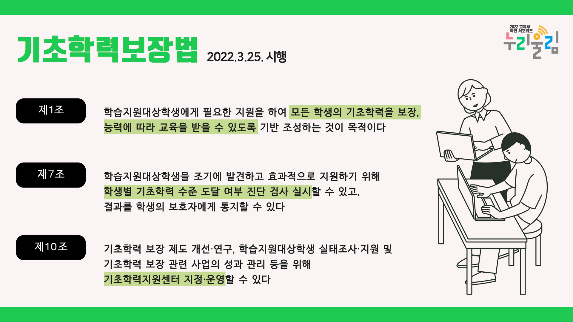 지난 3월 25일, 기초학력 평가 진단 결과를 바탕으로 체계적인 교육 환경을 지원하는 「기초학력 보장법」이 시행되었습니다. 모든 학생의 읽기, 쓰기, 셈하기 등 최소한의 성취기준을 충족시키기 위한 기초학력 보장법은 코로나로 발생한 학습 결손을 해소하는 데 중요한 역할을 할 것으로 기대됩니다. 오늘은 기초학력 보장법에 대한 자세한 설명과 함께 어떠한 단계를 거쳐 시행되고 있는지 설명해드리도록 하겠습니다.