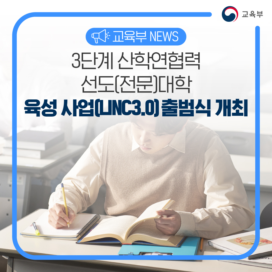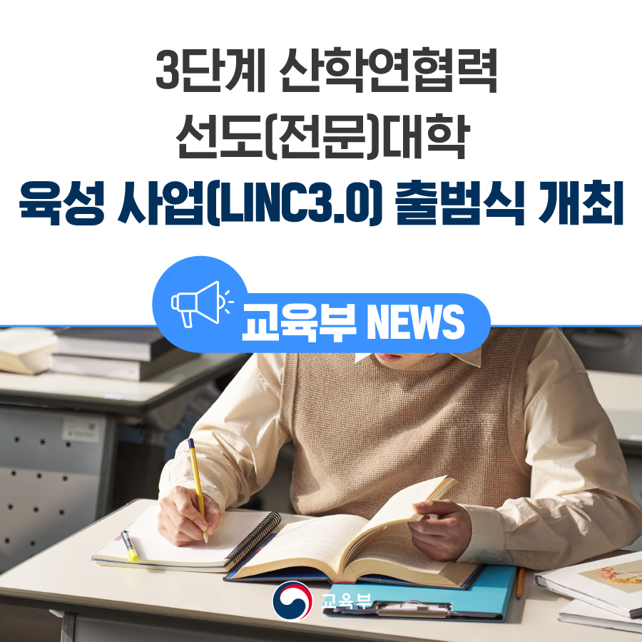 교육부와 한국연구재단(이사장 이광복)은 ‘3단계 산학연협력 선도(전문)대학 육성사업(이하 링크3.0*)출범식’을 6월 30일(목), 충남대학교에서 개최한다.