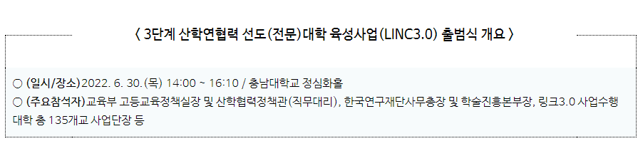 교육부와 한국연구재단(이사장 이광복)은 ‘3단계 산학연협력 선도(전문)대학 육성사업(이하 링크3.0*)출범식’을 6월 30일(목), 충남대학교에서 개최한다.