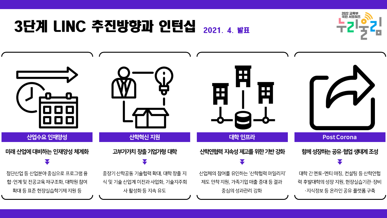 LINC 사업이란 “대학의 유형과 여건에 따른 산학협력 활성화를 통해 현장이 필요로 하는 창의적 인재양성과 새로운 기술개발, 산학협력 친화형 대학체제 구축 등 산학협력선도대학을 집중, 육성하고 선도 모델을 확산”하는 것을 목표로 운영하고 있습니다. 2012년부터 시작되어 현재 3단계를 시행 중이며, 총 4개의 구성이 되어 있으며, 미래 산업에 대비하는 인재양성부터 포스트 코로나에 대비하기 위한 공유와 협업 생태계 조성까지 다양한 추진을 진행하고 있습니다.