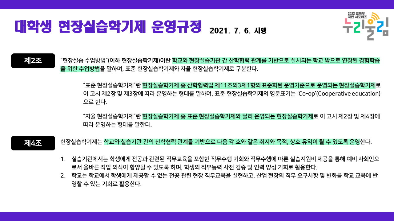 - 충남대학교는 GPS 기반의 스마트 지원 시스템을 구축하고 현장실습학기를 다녀온 후 피드백을 실시하는 등 현장실습 고도화를 확산하고 있습니다.