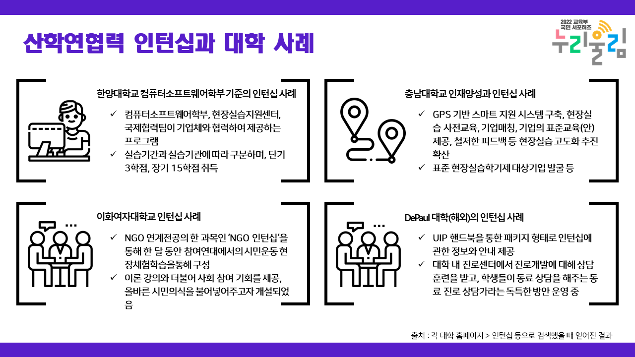 각 대학에서는 어떤 인턴십을 운영하고 있는지 사례를 살펴보도록 하겠습니다.