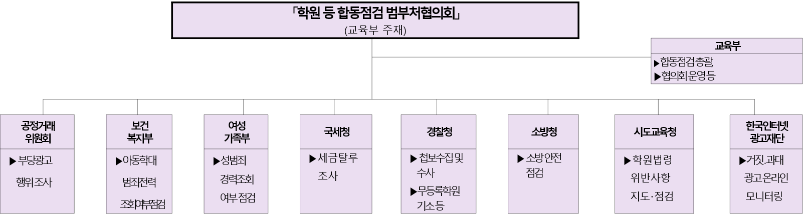 * 학원 등의 불법행위 근절을 위해 부당 광고행위 조사, 세금 탈루 적발, 법령 위반 첩보 수집, 성범죄․아동학대 위반사항 조사 등에 관계부처가 협력하고자 2016년도부터 구성․운영 중