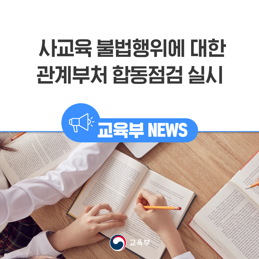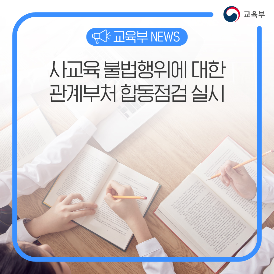 교육부(부총리 겸 교육부장관 박순애)는 학원 등의 불법 사교육 행위에 엄정 대처하기 위해 7월 19일(화)부터 12월 말까지 3차례(1차 7~8월, 2차 8~10월, 3차 11~12월)에 걸쳐 관계부처와 함께 합동점검을 실시한다.