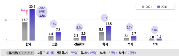 (신규수요) 디지털 시대 전략·기반 기술인 반도체 산업 규모 확장세에 따라, 산업 인력도 현재 약 17.7만 명에서 10년 후 약 30.4만 명까지 늘어나, 지금보다 약 12.7만 명의 인력 더 필요할 것으로 전망된다.