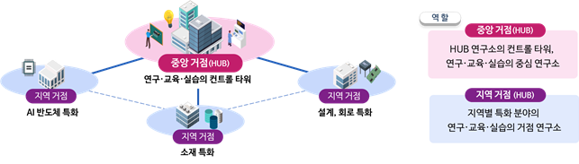 (대학 반도체 인재양성 거점) 반도체 교육 및 기초연구에 대한 핵심 기능을 수행할 수 있도록 서울대 반도체공동연구소 중앙 거점으로 두고, 권역별 반도체 공동연구소를 설치하여 각 연구소별 강점 분야 특성화하며, 연구소 간 협업체계를 구축한다.