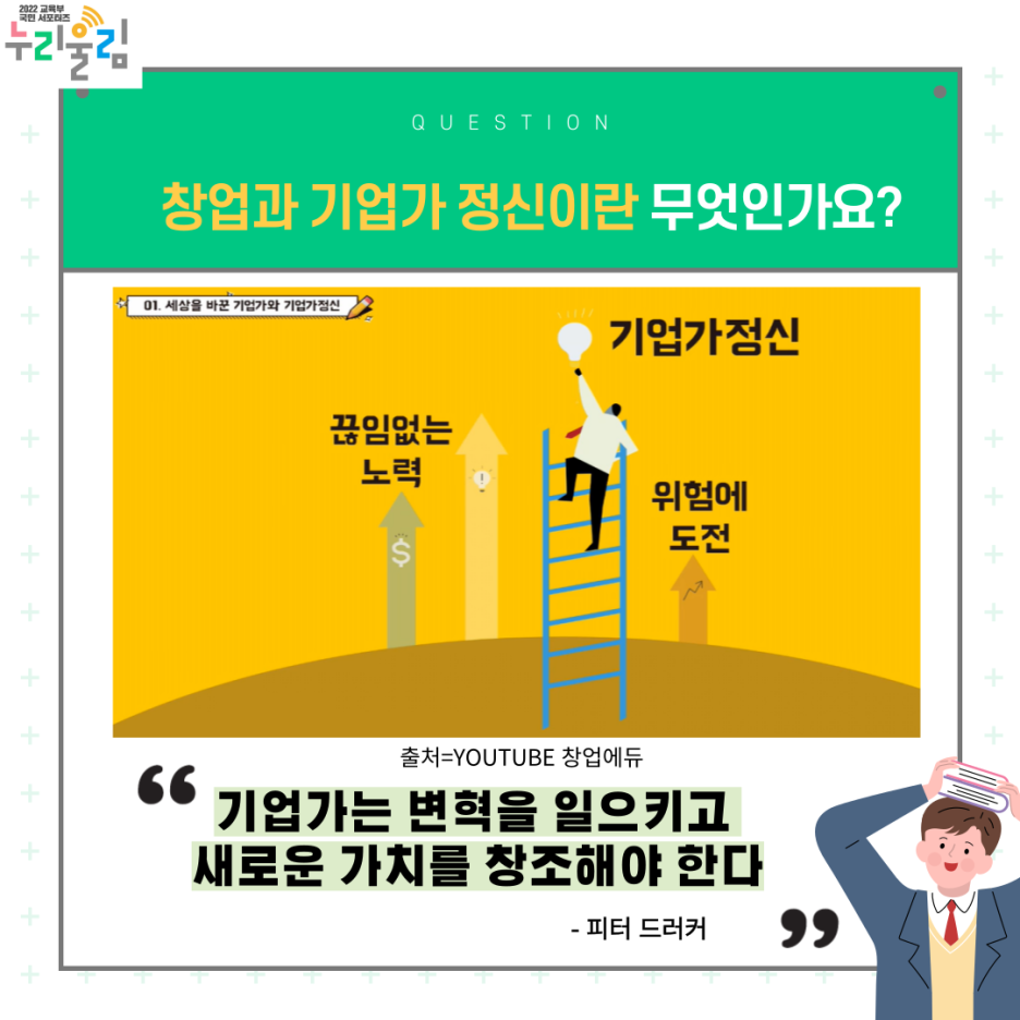 창업가 정신이란, “실패를 두려워하지 않으며, 혁신적이고 창의적인 사고를 바탕으로 사회적 문제를 해결하고 새로운 가치를 창출하려는 태도나 행동 양식”을 뜻합니다. 위험을 무릅쓰고, 아이디어를 바탕으로 새로운 가치를 창출 해내는 근본이 되는 창업가 정신은 세상을 바꾸는 기업의 기초가 되는 것입니다.