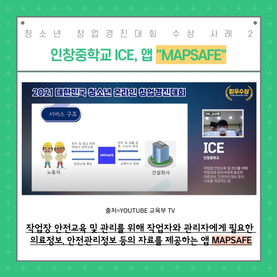 2021년 대한민국 청소년 온라인 창업경진대회의 최우수상은 바로 인창중학교 ICE팀이었습니다. 매년 발생하는 공사장 안전사고에 대한 대책의 필요성을 느끼고 건설 현장의 안전사고 예방과 재발 방지에 도움을 줄 수 있는 ‘MAPSAFE’앱을 구상했다고 합니다. MAPSAFE는 작업장 안전교육 및 관리를 위해 작업자와 관리자에게 필요한 의료 정보, 안전관리 정보 등의 자료를 제공하는 앱입니다.