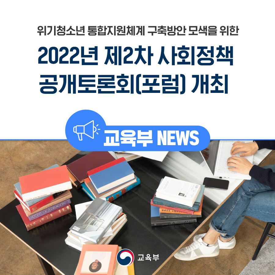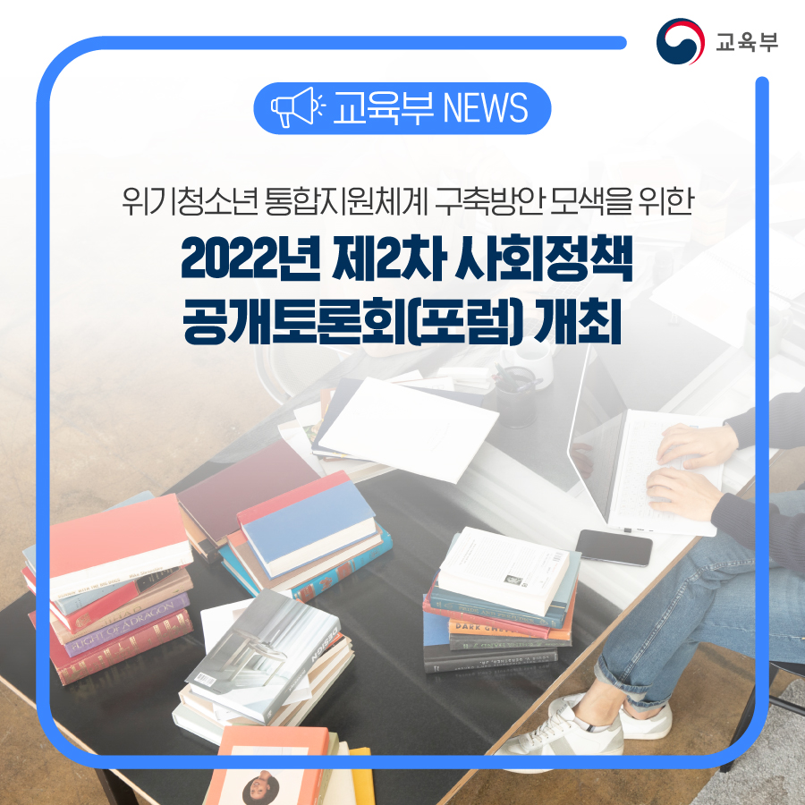 교육부(부총리 겸 교육부장관 박순애)는 한국직업능력연구원 등 사회 분야 연구기관*과 함께 ‘위기청소년** 통합지원체계 구축방안’을 주제로 7월 22일(금), 제2차 공개토론회(포럼)를 개최한다.
