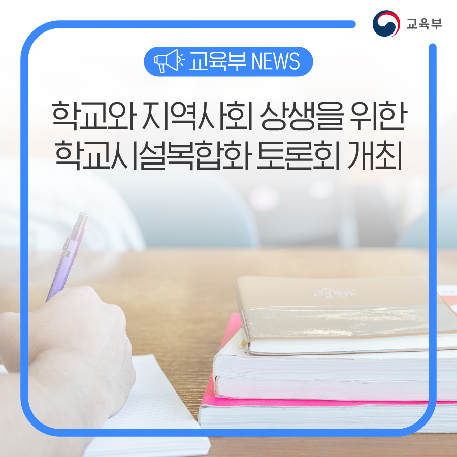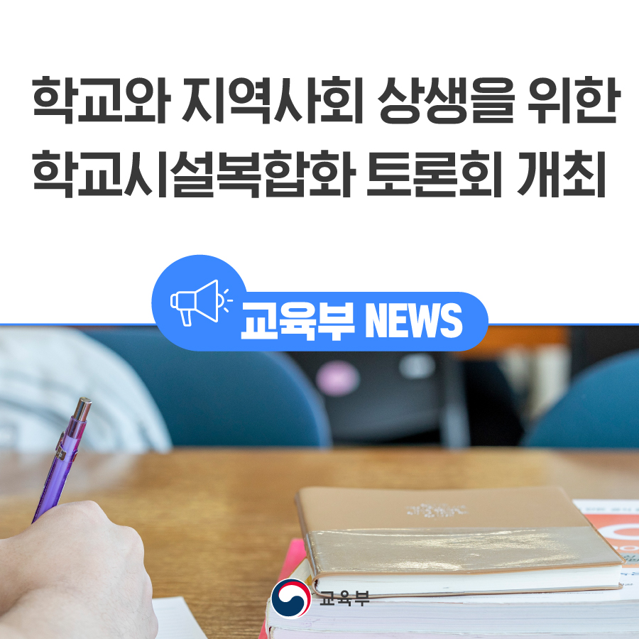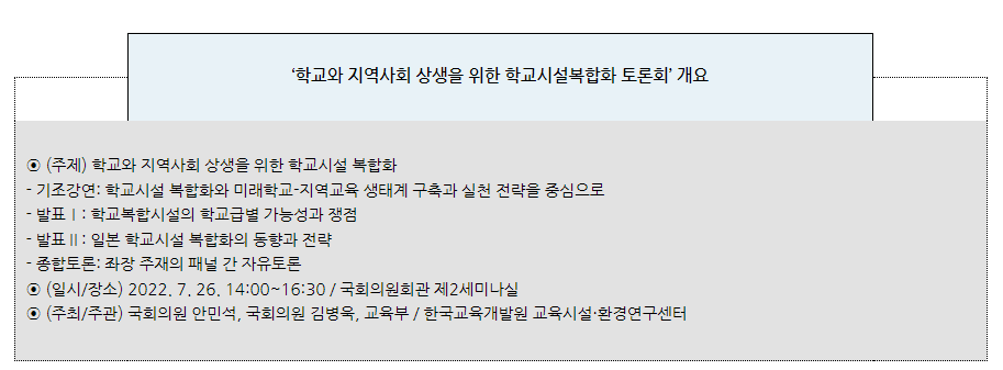 교육부(부총리 겸 교육부장관 박순애)는 국회 안민석 의원(더불어민주당, 경기 오산)과 김병욱 의원(국민의 힘, 경북 포항시남구울릉군) 및 한국교육개발원 교육시설·환경연구센터와 함께 제184차 한국교육개발원(KEDI) 교육정책토론회(포럼) 겸 ‘학교와 지역사회 상생을 위한 학교시설 복합화 토론회’를 7월 26일(화) 국회의원회관에서 개최한다.