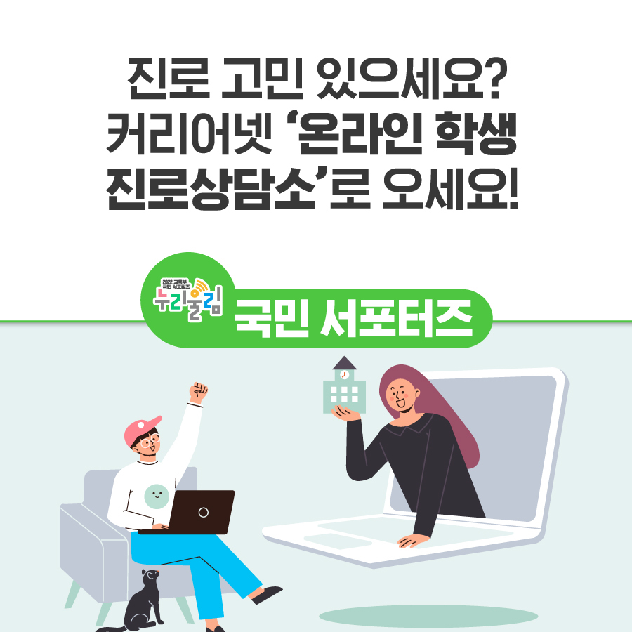 ‘온라인 학생 진로상담’은 교육부에서 학생들의 진로 탐색 및 설계, 취업 방법 등에 대한 상담을 받을 수 있도록 지원하는 프로그램입니다. 진로교육정보망 ‘커리어넷’에서 진로상담을 신청하면 1~2일 내로 배정받은 ‘진로상담위원단’ 소속 상담 선생님께 온라인으로 상담내용에 대한 답변을 받을 수 있습니다.