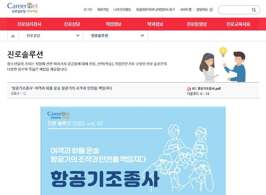 또한 ‘항공기 조종사’, ‘노년 플래너’, ‘그래픽디자이너’ 등 다양한 직업인들을 인터뷰한 내용들을 커리어넷 누리집에 게시해 진로 설계 방향을 제시하는 ‘진로솔루션’ 콘텐츠를 제공하고 있습니다. 이 밖에도 상담기법에 대한 끊임없는 연구와 분석을 바탕으로 매년 다양한 상담기법을 만들어내고 이를 토대로 한 진로상담 안내서를 개발하여 진로상담위원단에 관련 연수를 시행해 진로상담위원단의 역량 강화를 꿰차고 있습니다.
