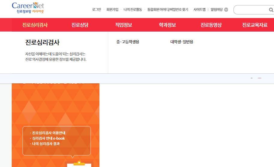 진로심리검사는 검사자의 흥미와 적성, 가치관 검사를 통해 객관적으로 진로 선택에 도움을 주는 시스템입니다. 중·고등학생용과 대학생·일반용 심리검사로 나뉘어 있습니다. 중·고등학생용 심리검사에는 직업적성검사, 진로성숙도검사, 직업가치관검사, 직업흥미검사, 진로개발역량검사가, 대학생·일반용 심리검사에는 진로개발준비도검사, 주요능력효능감검사, 이공계전공적합도검사, 직업가치관검사가 있습니다.
