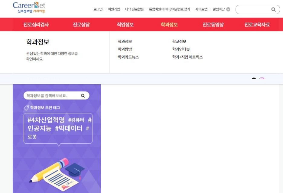 ‘커리어넷’ 사이트에서 온라인 진로상담은 물론, 다양한 학과, 직업정보 및 검사지가 제공되고 있습니다.