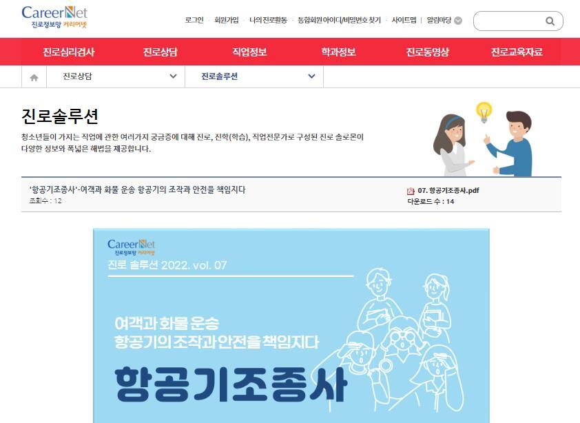 또한 ‘항공기 조종사’, ‘노년 플래너’, ‘그래픽디자이너’ 등 다양한 직업인들을 인터뷰한 내용들을 커리어넷 누리집에 게시해 진로 설계 방향을 제시하는 ‘진로솔루션’ 콘텐츠를 제공하고 있습니다. 이 밖에도 상담기법에 대한 끊임없는 연구와 분석을 바탕으로 매년 다양한 상담기법을 만들어내고 이를 토대로 한 진로상담 안내서를 개발하여 진로상담위원단에 관련 연수를 시행해 진로상담위원단의 역량 강화를 꿰차고 있습니다.