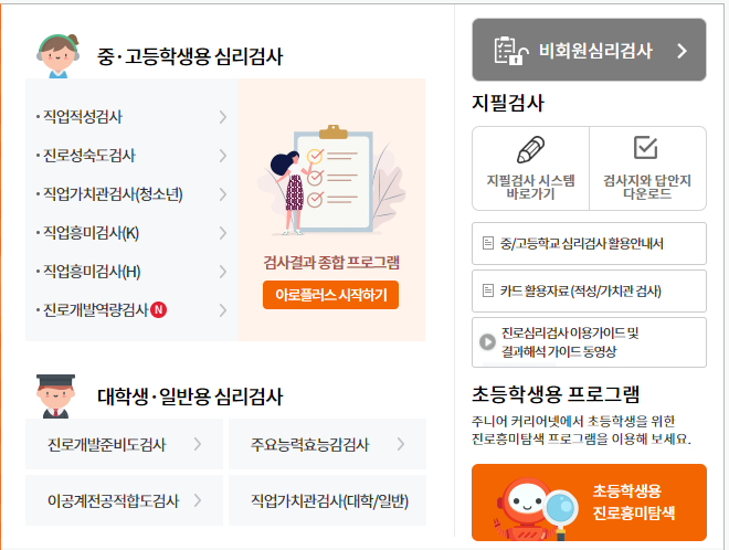 진로심리검사는 검사자의 흥미와 적성, 가치관 검사를 통해 객관적으로 진로 선택에 도움을 주는 시스템입니다. 중·고등학생용과 대학생·일반용 심리검사로 나뉘어 있습니다. 중·고등학생용 심리검사에는 직업적성검사, 진로성숙도검사, 직업가치관검사, 직업흥미검사, 진로개발역량검사가, 대학생·일반용 심리검사에는 진로개발준비도검사, 주요능력효능감검사, 이공계전공적합도검사, 직업가치관검사가 있습니다.