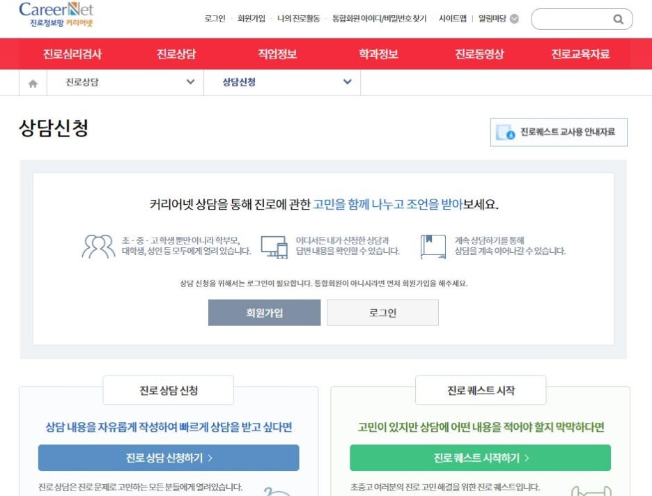 온라인 학생 진로상담을 위해서 앞서 알아본 ‘진로심리검사’, ‘진로퀘스트’, ‘진로솔루션’등의 시스템들은 진로교육정보망 사이트 ‘커리어넷’에 접속해야 받을 수 있는 서비스들입니다. 지금부터 커리어넷 활용 방법을 알려드리겠습니다.