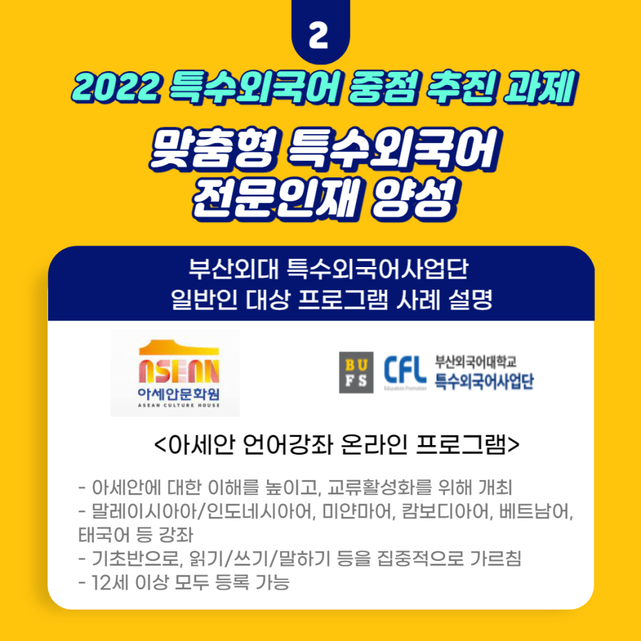 현재 부산외국어대학교 특수외국어사업단에서는 아세안문화원과 협력하여 부산 아세안문화원 ‘아세안 언어강좌’ 온라인 프로그램을 진행 중입니다. 특수외국어에 관심을 가지는 일반인들의 교육 접근성을 높이기 위해 부산 일반 시민 대상으로 5개 아세안 특수외국어 강좌를 온라인 수업으로 진행하고 있습니다.