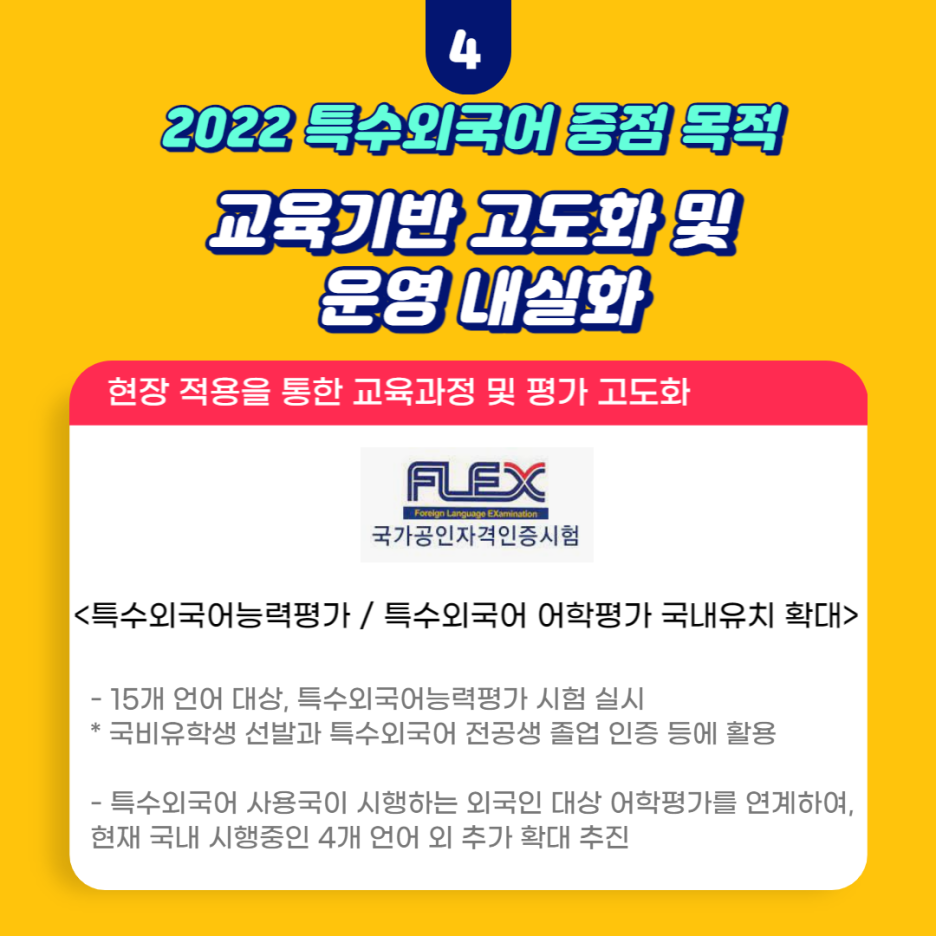 현재 한국외국어대학교 FLEX 센터에서 진행 중인 특수외국어능력평가는 기존 15개 언어를 대상으로 시행되고 있고(23년부터 20개 언어로 확대), 이는 국비유학생 선발과 특수외국어 전공생 졸업 인증 등에 활용되고 있습니다.