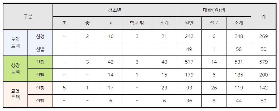 특히, 올해 ‘학생 창업유망팀 300 경진대회’에는 최초로 참가팀의 참여 동기와 수요를 반영하여 3가지 트랙으로 나누어 선발을 진행하였으며, 부처통합 창업경진대회 도전! K-스타트업 진출을 목표로 하는 도약트랙 269팀, 경진대회 내 육성 프로그램을 통해 실전창업을 준비하는 성장트랙 579팀, 아이디어 구상단계의 예비창업팀을 지원하는 교육트랙 142팀 등 전국에 있는 많은 학생 창업팀들이 참가하였다.