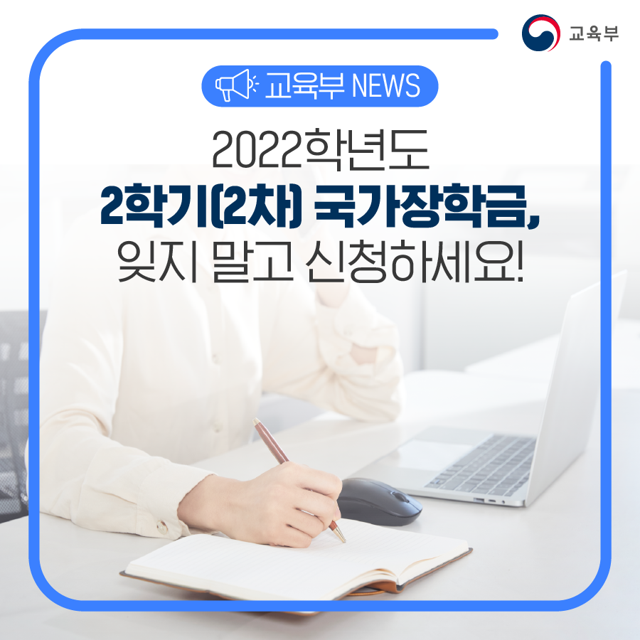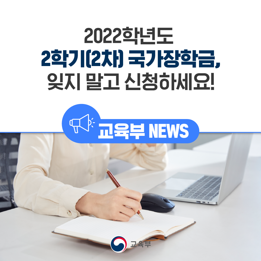 교육부와 한국장학재단(이하 ‘재단’)은 2022학년도 2학기 2차 국가장학금 신청을 8월 17일(수) 9시부터 9월 15일(목) 18시까지 받는다.