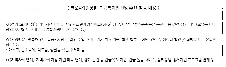 이에 따라 교육복지사각지대 해소를 위해 학습부진아 등이 밀집한 학교를 지원하는 교육복지우선지원사업과 교육지원청에서 학생을 직접 지원하는 교육복지안전망* 사업을 안정적으로 추진할 수 있을 것으로 기대된다.