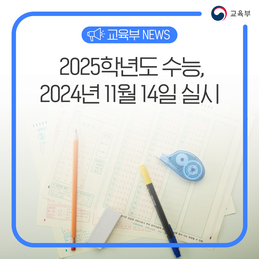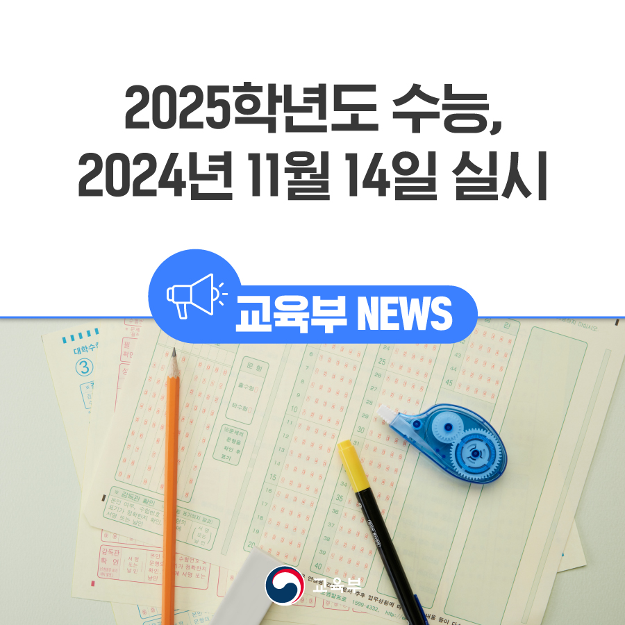 2025학년도 대학수학능력시험(수능)은 2024년 11월 14일(목)에 시행되고, 성적은 12월 6일(금)에 통지된다.
