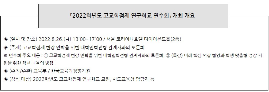 교육부(부총리 겸 교육부장관 직무대행 차관 장상윤)와 한국교육과정평가원(원장 이규민)은 ‘고교학점제 현장 안착을 위한 대학입학전형 관계자와의 토론회’를 주제로「2022학년도 고교학점제 연구학교 연수회」(이하 연수회)를 8월 26일(금) 서울 코리아나 호텔에서 개최한다.