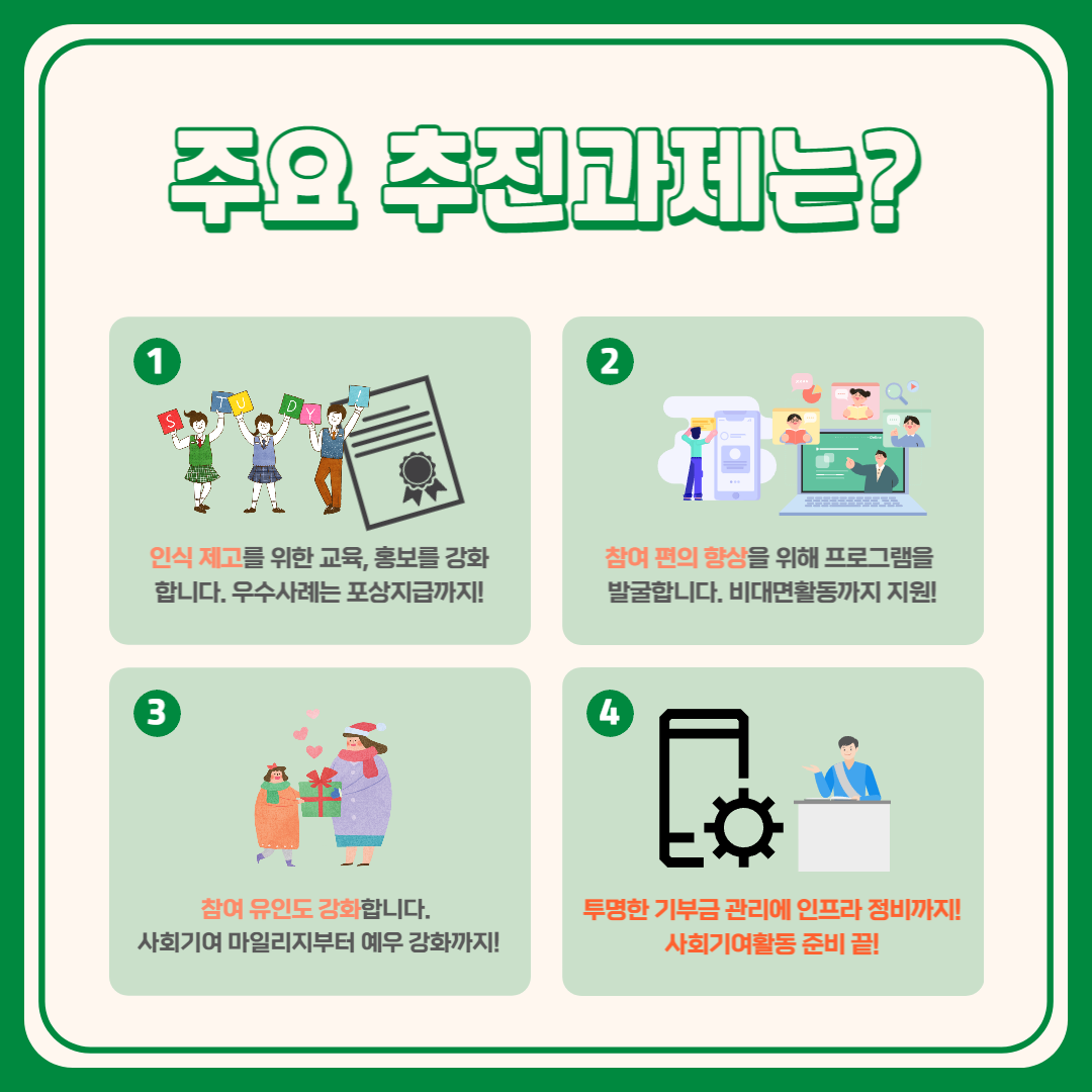 또한, 전반적인 사회기여활동의 향상을 위해, 참여자 개인·기관의 투명성이 향상됩니다. 특히 기부금 운영을 개선하여, 내 기부금이 어디로 가는지 파악할 수 있도록 국민 참여 확인제를 도입해 회계 책무성을 강화할 예정이라고 합니다.